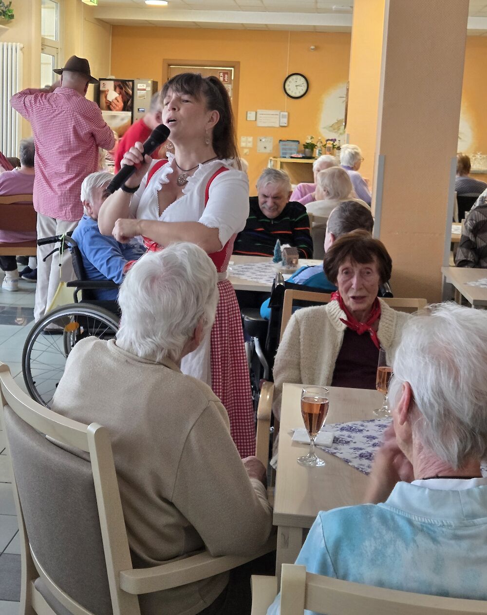 Zwischen unseren Bewohnerinnen und Bewohnern unterwegs, ausgestattet mit Trachten, Mikro und Musikanlage, zauberten die Künstler unvergessliche Momente. Es wurde geschunkelt, mitgesungen und gelacht. Wer mochte, genoss dazu ein Bier.
